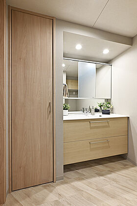 【洗面室】身支度に便利な3面鏡とミドルミラー付きの洗面化粧台。鏡の裏、ボウル下には収納があるので、ドライヤーや化粧品類がたっぷり収納できます。