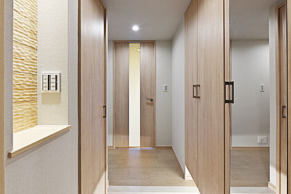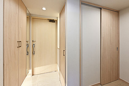 【玄関】LDKの扉を閉めると、玄関ドアを開けても居住空間が見えにくい設計です。姿見を備えているので、お出掛け前の身だしなみチェックに重宝します。
