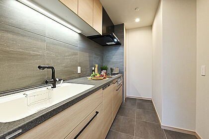 【キッチン】作業に集中しやすい、壁付けタイプのキッチンを設置しています。上下に収納を備えているので、散らかりがちなキッチン小物が片付きます。