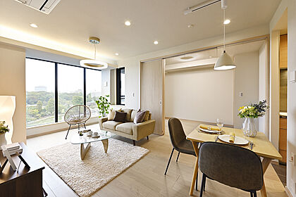 【LDK/約12.5帖】北東向きの大きな窓からは、不忍池が望めます。開放的な眺めとともに、ゆったりとご家族でお寛ぎいただけます。
