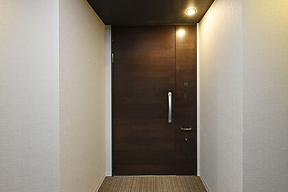 【玄関】重厚感溢れる玄関ドア。TVモニター付きインターホンや、オートロック、内廊下設計を採用しており、防犯面にも配慮しています。