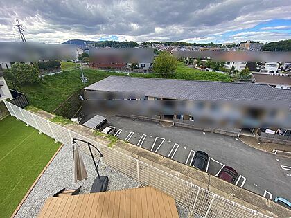 「眺望」■二階の窓から望む庭とウッドデッキ、開放的な高台の景色が広がります。