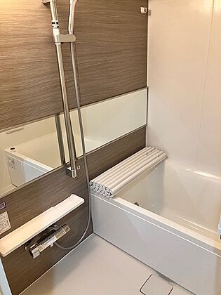 •  明るい照明とシンプルなデザインが特徴のお風呂。ゆったりとした空間で、リラックスしたひとときを楽しめます。浴室乾燥機付きなので、雨の日でも洗濯物が干せます。