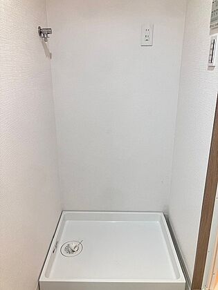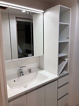•  洗面台横にランドリーコーナーもゆったり。ドラム式も置ける余裕