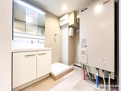 【洗面所】清潔感の溢れる上品なデザイン。使いやすさにもこだわり三面鏡を採用、明るく仕上げております。