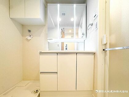 【洗面化粧台・洗面所】清潔感の溢れる上品なデザイン。使いやすさにもこだわり三面鏡を採用、明るく仕上げております。