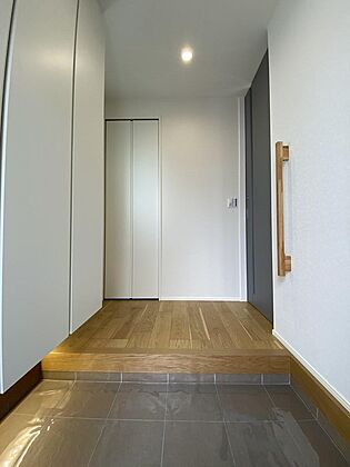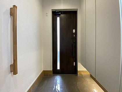 •  【玄関】大型のシューズボックスがある玄関。ご家族みなさんの靴を収納していただけます。シューズボックスの下には照明も埋め込まれています。間接照明で素敵な雰囲気を演出します。