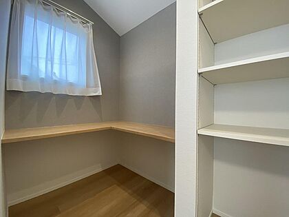 •  【書斎】書斎スペースの様子です。カウンターテーブルの他に本棚が造作されています。