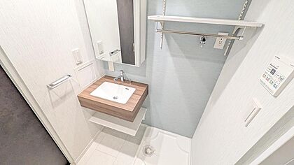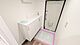 優しい色合いの洗面所。洗面台の鏡は収納となっています。
