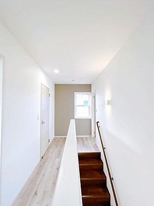 •  【リフォーム後】2階廊下です。フロアタイルの重ね張り、壁・天井のクロス張替えを行いました。バリアフリー仕様になりました。