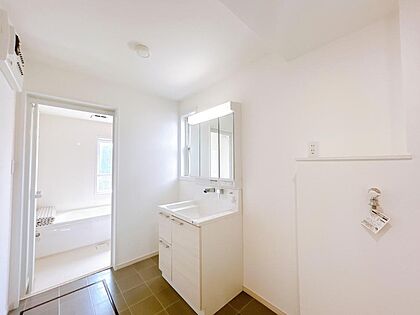 •  【リフォーム後】洗面化粧台は新品交換いたしました。三面鏡タイプのものを採用しておりますので収納力もばっちりです。