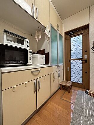 食器も鍋も片付くカップボードあり!キッチンと同じクリーム色で柔らかい雰囲気♪