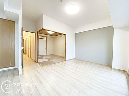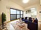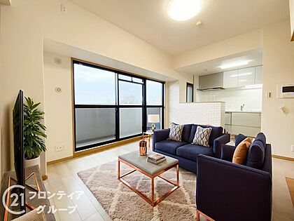 【家具設置イメージ画像】リビングは、柔らかな色調でまとめられており、心安らぐ雰囲気を演出します。リラックスできる空間です。