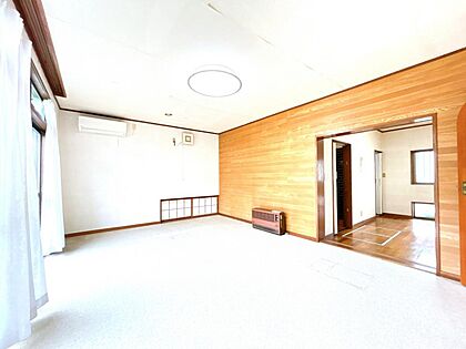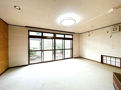 【リビング10/26撮影】絨毯からフローリングへ変更、クロス張替え、照明器具交換、火災報知器設置いたします。南側の掃き出し窓からはお庭に出られます。