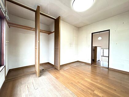 【内外装リフォーム予定】2階東側洋室のの写真です。クロスの張替え、フローリングの重ね張り、照明交換を行います。