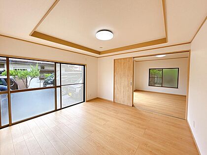 【リフォーム完成】1階中央洋室はフローリング張り、クロス張替を行いました。リビング側には新しく引き込み戸を設置しておりますので続き間としてもご利用いただけます。