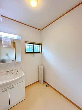 【リフォーム完成】洗面所の写真です。クッションフロア張替、洗面化粧台交換、クロス張替などを行いました。白を基調とした清潔な空間へリフォームしております。
