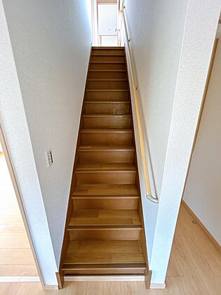 【リフォーム完成】階段の写真です。踏板はクッションフロア張りを行い、手すりとノンスリップを設置いたしました。安全に上り下りができるように配慮し、リフォームを行っております。