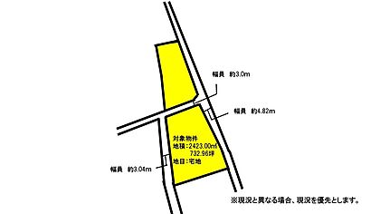| 土地面積/坪(坪単価) | 2,423.00m2(登記簿)/734.24坪(4.10万円) | 代表的な接道 | 三方 公道 西 3m、東 4.8m ※詳細は備考欄をご確認ください |