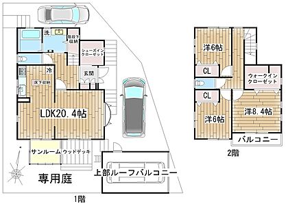 LDK20帖超の3LDKにサンルームがプラスされた間取りです。また附属建物のシャッター車庫にルーフバルコニーが備わり、部屋数以上のゆとりが感じられます。