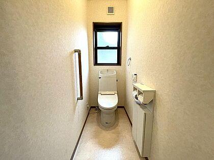 トイレは1階と2階の二箇所に備わります。いずれも手すり付き、ウォッシュレットと壁面収納のある奥行き充分の室内で、とても丁寧に使われています。