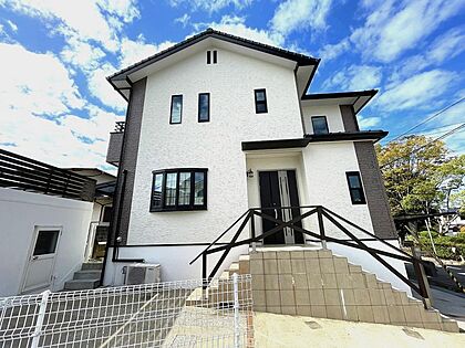 建物は2025年8月に外壁屋根の防水塗装工事済みで新築同様の外観になりました。建売住宅には見られない洗練されたデザインが好印象です。隣接する公園の緑が美しく鮮やかです。