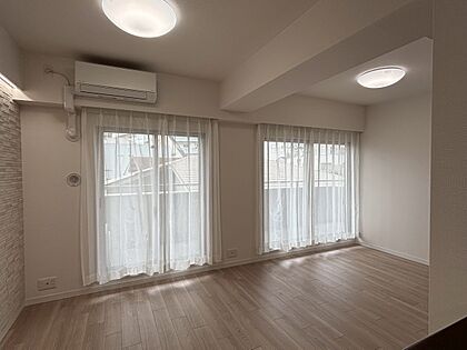 【LDK】掃き出し窓が2ヶ所に設けられた、開放感のある室内。心地よい風と陽光を取り込みます。LDKにエアコンが1台設置されており、新生活をスムーズにスタートできます。