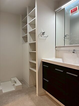 【洗面化粧台】水垢が溜りにくくお手入れがしやすい上方吐水タイプの水栓です。洗面化粧台の左手に可動棚があり、洗面用品やタオルを整頓できます。