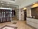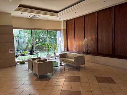 【ロビー】ガラスウォールから自然光を取り込む、明るいロビー。折り上げ天井で開放感があります。椅子とテーブルがあり、待ち合わせなどにご活用いただけます。