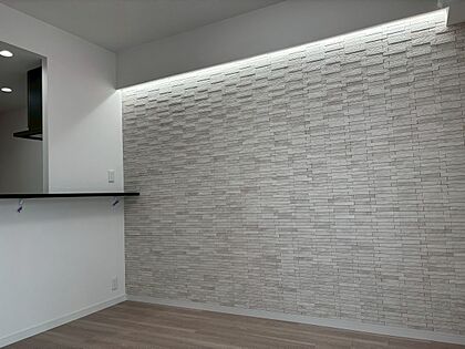 【LDK】LDの壁一面にエコカラットが採用されています。間接照明が気品ある空間を演出。デザイン性のほか、消臭や調湿機能に期待ができます。