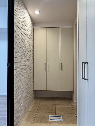 【玄関】壁一面にエコカラットが施された、デザイン性の高い玄関です。天井高のシューズボックスや、3ヶ所の廊下収納が備わっています。
