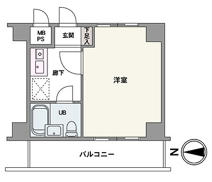 4階部分の西向きバルコニー付「1K」の住戸。洋室は2面採光が確保され、通風良好◎システムキッチン、3点式ユニットバス、洗濯機置き場、シューズボックス、インターホンなどが備わっています。