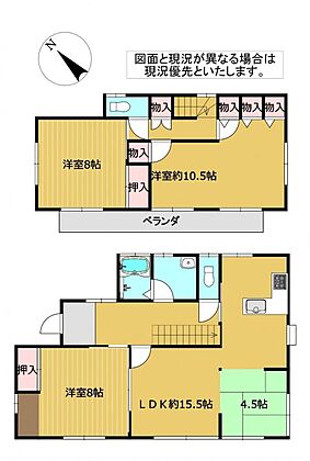 【間取図】15.5帖LDKの木造2階建てのお家です。2階各居室には2つ窓があり、風通しもいいお部屋になっていますね。また各部屋に収納があるので、部屋を広く使える間取りになっています。