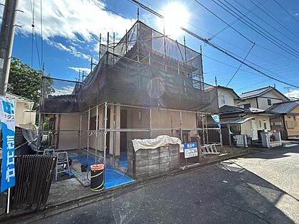 外観のお写真です。前面道路は幅員約5mございますので、駐車やすれ違いがしやすいですね。