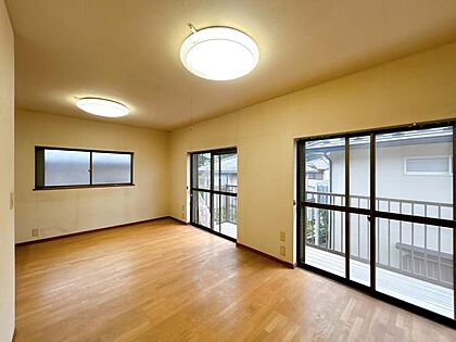 【リフォーム前】2階10.5帖洋室のお写真です。大きな掃き出し窓2か所を含めた二面採光ですので、日当たりだけでなく風通しもよさそうですね。クロス張替、照明交換予定です。