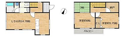 【間取り図】約14.78帖LDKの2階建てのおうちです。対面キッチンがございます。