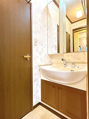【洗面室】洗面室の写真です。大きな鏡がございますので、朝の忙しい時間でも並んで支度をすることができ安心ですね。