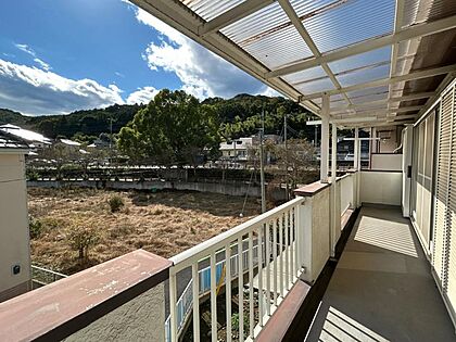 •  【ベランダ】屋根付きの広々としたバルコニーは、天候を気にせず快適に過ごせる憩いの空間。周囲には緑が広がり、自然を感じながらリラックスできる環境です。