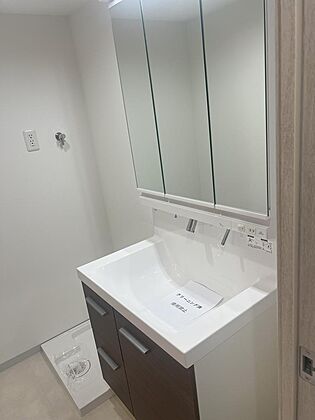 室内(2025年8月)撮影。洗面台です。3面鏡になっております。