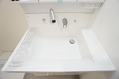 ◆洗面化粧台◆シャワーホース付き水栓でお掃除も楽にできます。水栓のレバーは、お湯とお水の切り替えで「カチッ」と音が鳴ることで、無駄に給湯器(お湯)が作動しない、節電効果があります。