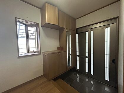 【玄関】玄関の写真です。玄関ポーチは屋根つきです。ちょっとそこまでの時に便利な折りたたみ自転車も玄関先に置けますよ。