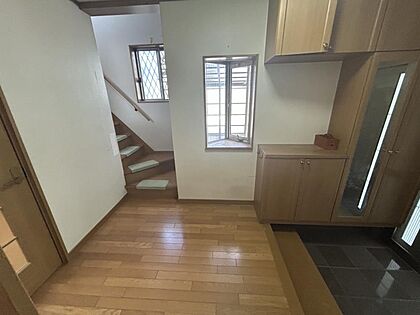 【リフォーム中】玄関内部の写真です。こちらは天井・壁のクロス張替え、フローリングの重ね張りを行います。家族と来客をお出迎えする玄関は住宅の顔。暗くなりがちな玄関も明るく清潔感漂う空間に仕上げていきます