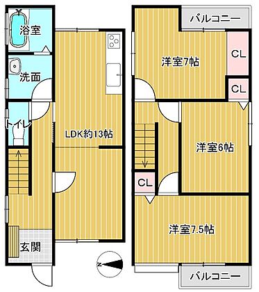 【間取り図】2階建て3LDKの間取りです。部屋を広く使える間取りになっています。