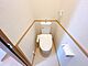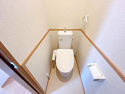 【リフォーム済】1階部分のトイレはTOTO製の温水洗浄機付きトイレに新品交換いたします。表面は凹凸が少ないため、汚れが付きにくくお手入れが簡単です。