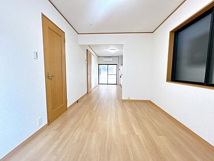 【リフォーム済】リビングでは壁天井クロス張替え、LED照明器具新品交換いたしました。掃き出し窓があるので荷物の出し入れに便利ですね。