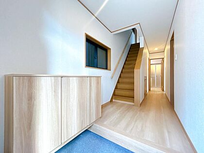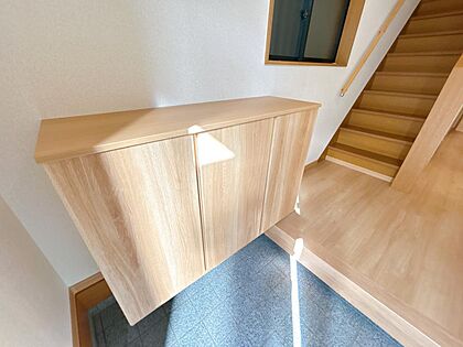 【リフォーム済】玄関はシューズボックスを新品交換致しました。ご家族のお履き物が沢山収納できるので玄関周りがスッキリします。壁天井クロス張替え、LED照明器具照明器具いたしました。