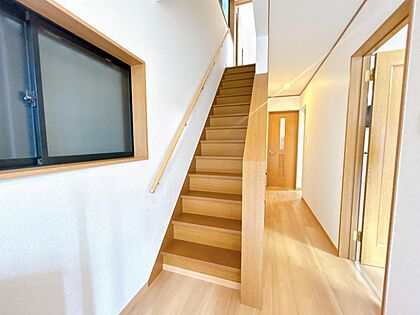 【リフォーム済】階段部分です。新しく手すりを設置いたしました。壁天クロス張替え、LED照明交換いたしました。