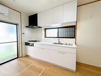 【リフォーム済】キッチンはハウステック製のシステムキッチンに新品交換いたしました。レンジフードには照明がついているので、手元が明るく料理ができます。