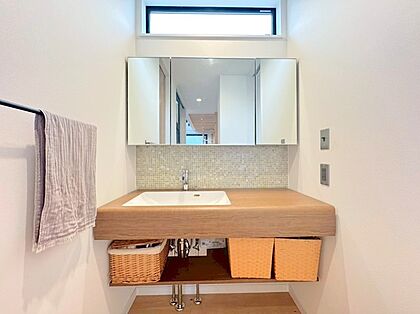 〜人気の三面鏡を採用〜 ・洗面台は三面鏡仕様なので鏡の角度を変える事で頭の後ろの方までご確認可能です。 ・鏡の裏が収納になっておりますので、洗面台周りもスッキリと片付きます。