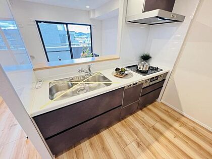 カウンターキッチン越しに会話も楽しめるダイニングキッチン。